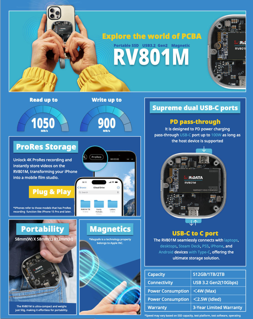 Anumite versiuni ale modelului includ sistem de atasare magnetica (compatibil MagSafe), permitand fixarea usoara pe dispozitivele tale. Indiferent de versiune, SSD-ul Ridata RV801M iti ofera stabilitate, racire eficienta si transfer sigur al datelor.